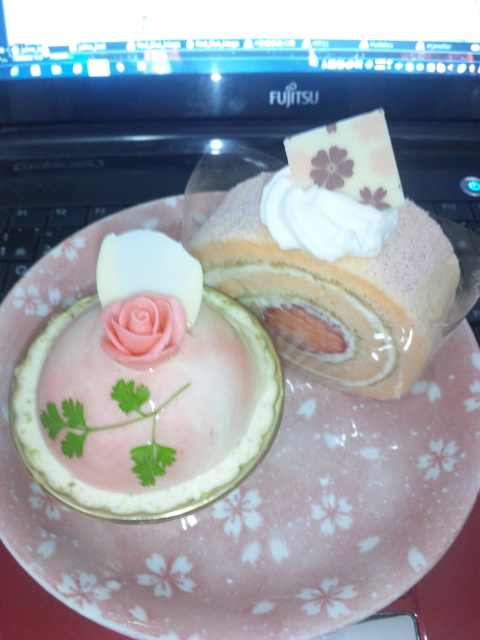 桜とイチゴのロールケーキとムース系(名前忘れた)です。
